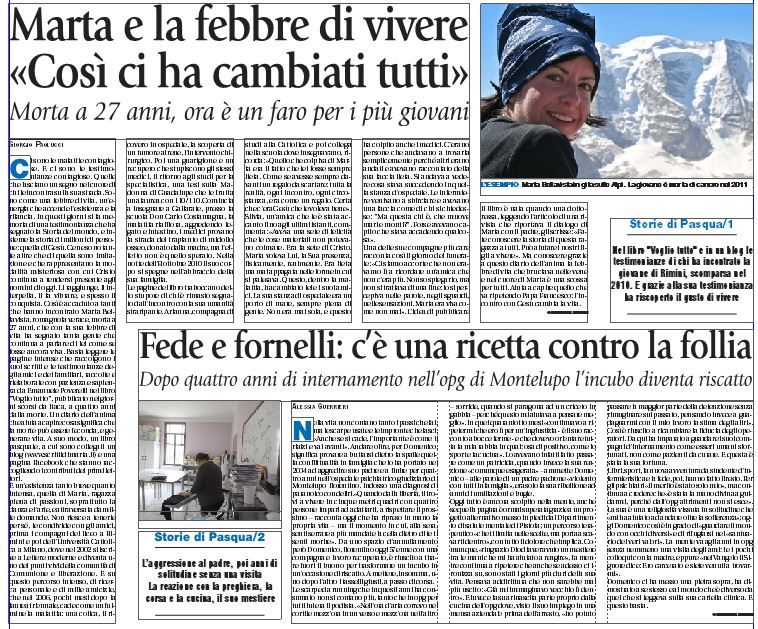 Ci sono le malattie contagiose. E ci sono le testimonianze contagiose. Quelle che lasciano un segno nel cuore di chi le incontra sulla sua strada. Sono come una febbre di vita, un’energia che accende l’esistenza e la rilancia. In questi giorni si fa memoria di una testimonianza che ha segnato la Storia del mondo, e in- sieme la storia di milioni di persone: quella di Gesù. Ce ne sono tante altre che di quella sono imitazione e che rappresentano la modalità misteriosa con cui Cristo continua a rendersi presente agli uomini di oggi. Li raggiunge, li interpella, li fa vibrare, e spesso li conquista. Così è accaduto a tanti che hanno incontrato Marta Bellavista, romagnola verace, morta a 27 anni, che con la sua febbre di vita ha segnato tanta gente che continua a parlare di lei come se fosse ancora viva. Basta leggere le pagine intense che raccolgono i suoi scritti e le testimonianze degli amici e dei familiari, raccolte e rielaborate con pazienza e sapienza da Emanuele Poverelli nel libro “Voglio tutto”, pubblicato nei giorni scorsi da Itaca, a quattro anni dalla morte. Un diario dell’anima che aiuta a capire cosa significa che la morte può essere feconda, e generare vita. A suo modo, un libro pasquale, a cui sono collegati un blog (www.scrittidimar- ta.it) e una pagina Facebook che stanno raccogliendo i contributi dei primi lettori.